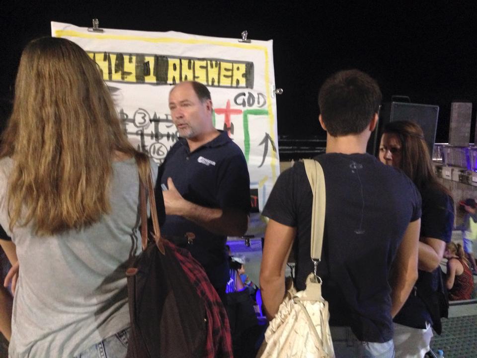 Photo: Loren is sharing the gospel with three young guys who were headed to some clubs.