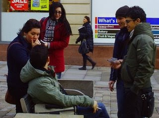 In Market street we set up and discovered to our frustration and dismay that the wind was just strong enough to pick up tracts and even bibles and scatter them over the street periodically. None the less we persisted with the bible table to give people opportunity to have the word of God for free. Geraldine (a manchester local) joined us and we prayed together and then began to tract the area.