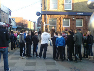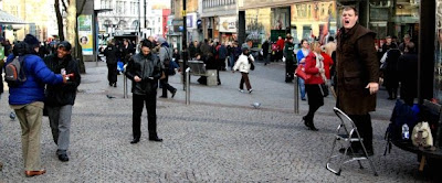 I had planned on not preaching today due to the fact that my voice was still weak from the sudden change in temperatures, from the heat of Australia to the freezing conditions of the UK. But as we left the car park in which we parked we could hear the sounds of a preacher proclaiming the gospel. So we walked over to listen to this evangelistic preacher. They were standing under a huge white Christmas tree with a PA set up.